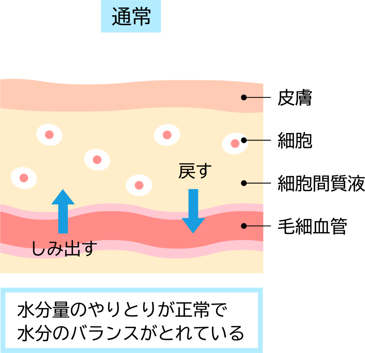 一方、細胞から生じた老廃物は間質液へ排出され、再び血管やリンパ管へ回収されます。